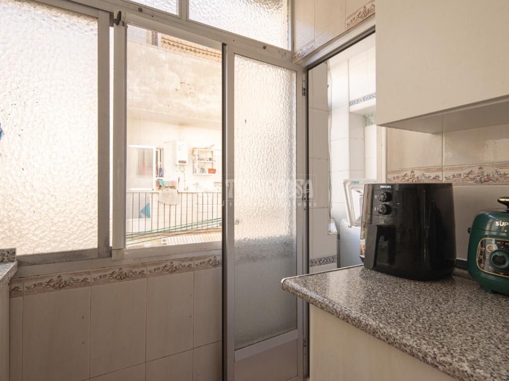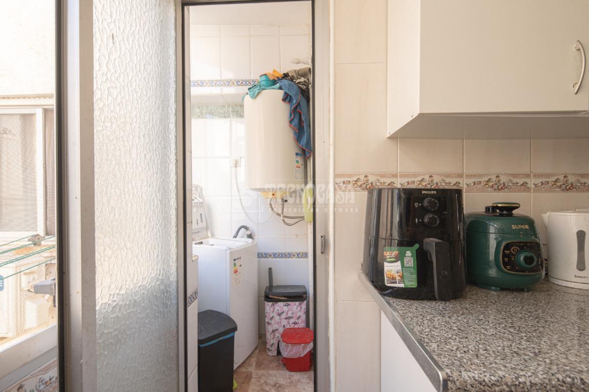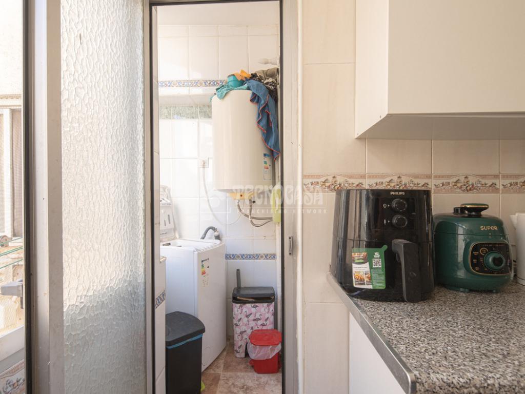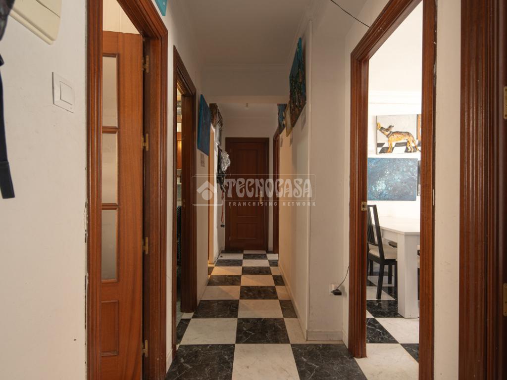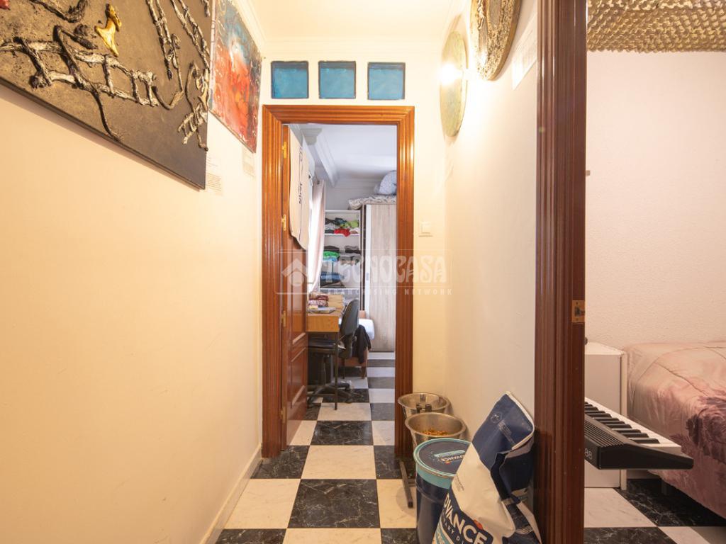 Al acceder a la vivienda (completamente de paredes lisas) encontramos un pasillo desde el cual se van distribuyendo todas las estancias, a izquierda y derecha. En la primera puerta a la izquierda encontramos la cocina con lavadero y, en la segunda siguiendo el pasillo de la entrada, el baño. Si continuamos hasta el final, también a mano izquierda se distribuyen dos de los dormitorios: la habitación doble y el cuarto acondicionado como estudio/habitación de invitados.